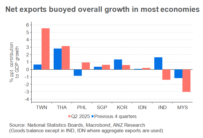 ANZ Research does not expect this strengthening to be sustained except in Taiwan, which continues to benefit from the global tech cycle. Vietnam does not publish GDP-based investment data on a quarterly basis, but ANZ Research suspects sustained foreign-direct investment flows are keeping capex buoyant.